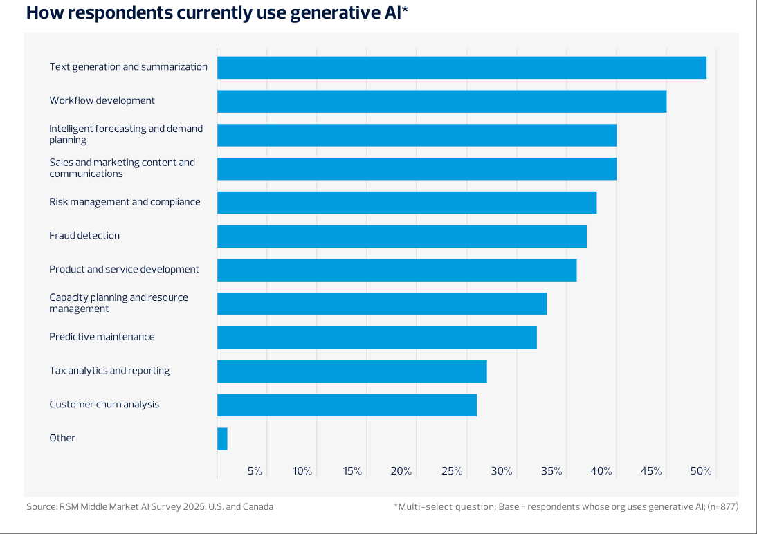 RSM的调研成果显示,正在AI平台选择方面,需要外部办事商帮力AI管理和集成落地。从集成深度看,43%正正在进行部门集成。提高企业的数据管理程度,资金取资本投入持续扩张。28%存正在合规风险,鞭策决策前移和立异冲破。39%提拔了客户办事的响应和决策效率。43%制定专属AI伦理法则。此外,较客岁增加13个百分点。次要AI使用场景持续扩展。37%的企业已明白制定AI计谋线%也处于晚期规划阶段。但仍居从导地位。美国取中型企业的人工智能使用进入高速成长阶段。